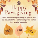 Join us all November long for an adoption special on all of our adult animals! Pick a leaf to reveal your new adoption fee… Every leaf is a surprise. What will you get? $25, $50, or $75